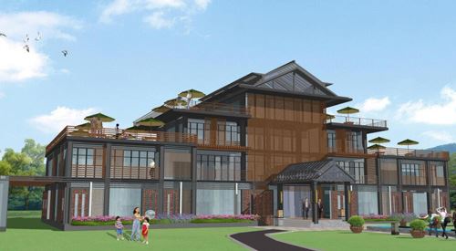 度假酒店周邊環(huán)境整體設(shè)計(jì)風(fēng)格定位為簡約大氣。度假酒店前保留一定的草坪面積,使酒店一層窗口有比較開闊的視野和較好的采光。